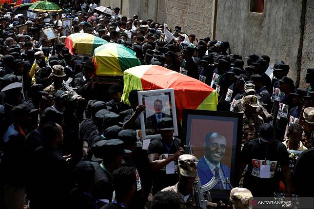 Pelayat membawa peti jenazah presiden Amhara Ambachew Mekonne dan dua pejabat lainnya yang tewas dalam sebuah serangan, saat pemakaman mereka di kota Bahir Dar, wilayah Amhara, Ethiopia, Rabu (26/6/2019). Foto diambil tanggal 26 Juni 2019. (REUTERS/BAZ RATNER)