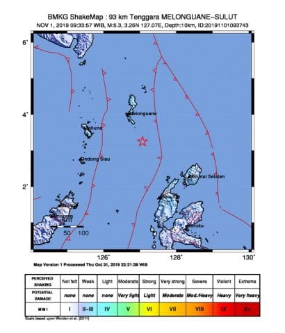 BERITA.NEWS, Jakarta – Gempa magnitudo (M) 5,3 mengguncang sebelah tenggara Melonguane, Sulawesi Utara. Gempa ini tidak berpotensi tsunami.