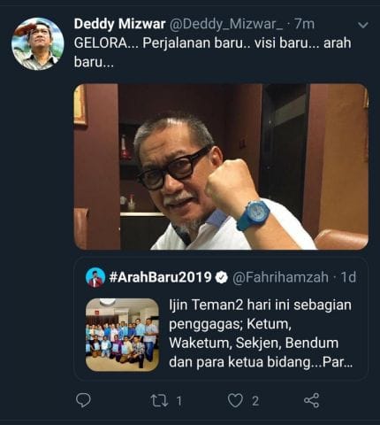 “GELORA…Perjalanan baru…visi baru…arah baru…,” tulis Demiz di akun twitternya empat jam lalu.