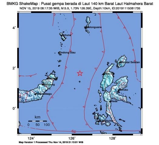 “Hingga pagi ini pukul 06.59 WIB telah terjadi 74 aktivitas gempa susulan (aftershocks) di Laut Maluku utara pasca gempa utama M 7.1,” tulis Kepala Bidang Mitigasi Gempa Bumi dan Tsunami (BMKG) Daryono di Twitter lewat akun @DaryonoBMKG pada Jumat pagi (15/11/2019).