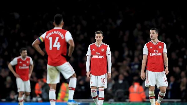 Para pemain Arsenal tertunduk setelah mereka dipermalukan oleh tamunya Brighton di Emirates Stadium, Jumat (6/12/2019) dini hari WIB. (net)