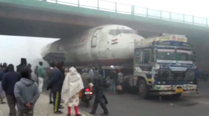 Truk yang membawa badan pesawat India Post itu terjebak di bawah sebuah jembatan. Saat berita ini dilaporkan Sputnik, masih dilakukan upaya untuk memindahkannya dari bawah jembatan.