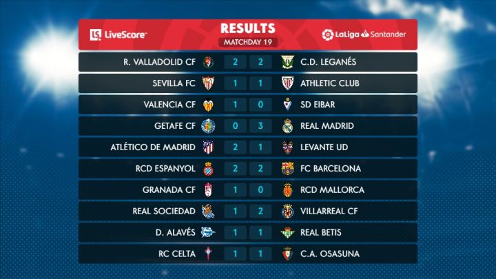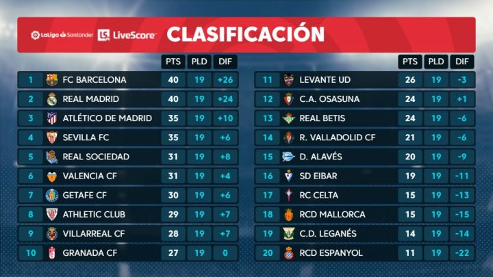 Barcelona berada di puncak klasemen La Liga pekan ke-19, walau gagal menang di pekan ini. Barcelona meraih 40 poin. Jumlah poin Barcelona sama dengan Real Madrid, tetapi klub asal Catalan unggul selisih gol lebih baik.