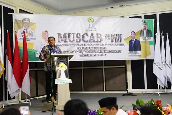 BERITA.NEWS, Bone – Bupati Bone HA Fahsar M Padjalangi menghadiri Musyawarah Cabang(Muscab) VIII Badan Pengurus Cabang Himpunan Pengusaha Muda Indonesia (HIPMI) Kabupaten Bone. Muscab digelar di Hotel Helios, Jalan Langsat, Sabtu (22/2/2020).