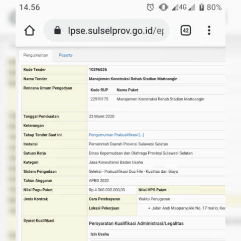 Data Lelang Manajemen Konstruksi Stadion Mattoanging di LPSE Pemprov.