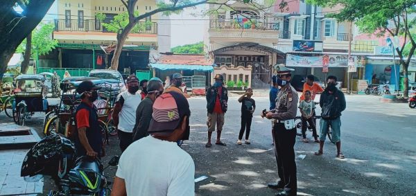 Personil Sat Lantas Polres Bulukumba yang dipimpin Kanit Laka Ipda Herman, memberikan imbauan dan membagikan masker kepada komunitas sopir mobil, truk, dan tukang becak di alun-alun Kota Bulukumba (Pasar Tua) Kelurahan Loka, Kecamatan Ujung Bulu, Kabupaten Bulukumba, Sulawesi Selatan. Langkah ini sebagai upaya memutus mata rantai penyebaran virus corona (covid-19).