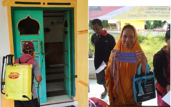 Mereka melakukan penyemprotan cairan disinfektan bersama anggota gugus yang telah terbentuk. Selain itu, mereka juga melakukan pembagian masker kepada warga, Rabu (8/4/2020).