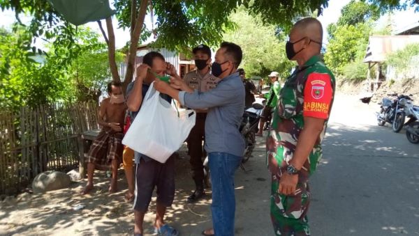 Saat pembagian masker ke masyarakat para jurnalis didampingi oleh Bhabinkamtibmas Bripka Hasruddin, bersama Babinsa Serka Safri. Mereka membagikan ratusan masker.