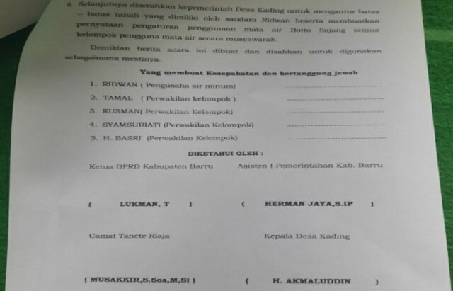 “Yang jadi pertimbangan saya di poin ke 6, disitu tertulis bahwa bersedia menyerahkan ke pihak desa untuk mengatur batas-batas tanahnya. Sedangkan saya ini yang punya sertifikat yang dikeluarkan oleh Pertanahan Kabupaten Barru,” ungkap Ridwan.