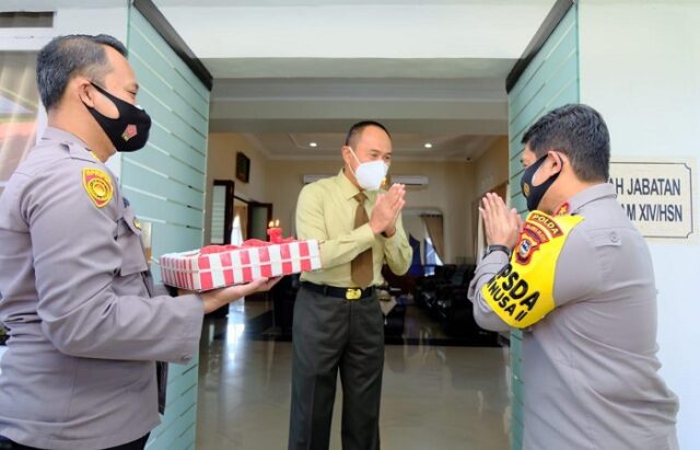 Kapolda bersama para Pejabat Utama Polda Sulawesi Selatan datang langsung ke rumah dinas Pangdam dengan membawa kue ulang tahun.