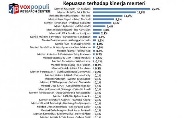 “Sebaliknya, sejumlah menteri dinilai berkinerja terbaik, yaitu Menteri Keuangan Sri Mulyani (25,3 persen), Menteri BUMN Erick Thohir (18,8 persen), dan Menteri Sekretaris Negara Pratikno (13,0 persen),” kata Dika.