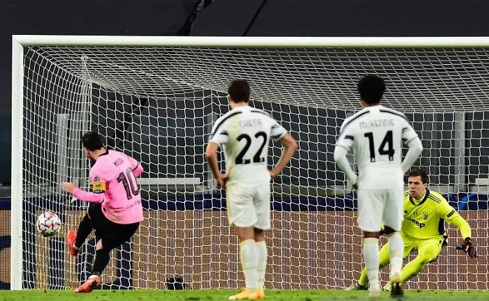 Megabintang Barcelona Lionel Messi (kiri) mengeksekusi tendangan penalti untuk mencetak gol kedua timnya ke gawang Juventus dalam lanjutan Grup G Liga Champions di Stadion Allianz, Torino, Italia, Rabu (28/10/2020) waktu setempat. ANTARA/REUTERS/Massimo Pinca.