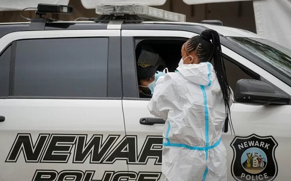 Petugas kesehatan melakukan uji usap terhadap petugas Polisi Newark di dalam mobilnya di pusat uji COVID-19 drive-thru, saat terjadi lonjakan infeksi virus corona (COVID-19) di Newark, New Jersey, Amerika Serikat, Kamis (12/11/2020). ANTARA/REUTERS/Brendan McDermid/FOC/djo.
