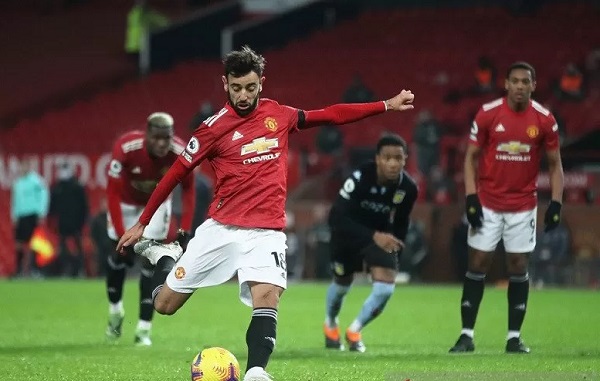 Bintang Manchester United Bruno Fernandes mengeksekusi tendangan penalti untuk mencetak gol penentu kemenangan atas Aston Villa dalam lanjutan Liga Inggris di Stadion Old Trafford, Manchester, Inggris, Jumat (1/1/2021) waktu setempat. (ANTARA/REUTERS/POOL/Carl Recine)
