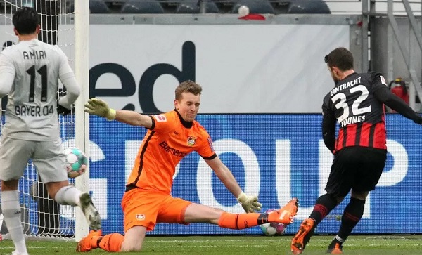 Gelandang Leverkusen Nadiem Amiri mengemas gol cantik dengan sepakan tumitnya, saat pertandingan di Frankfurt baru berusia sepuluh menit.