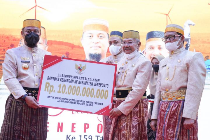 “Alhamdulillah, kami telah menyerahkan bantuan keuangan senilai Rp 10 Miliar untuk mendukung pembangunan di kabupaten Jeneponto,” kata Gubernur Andalan.