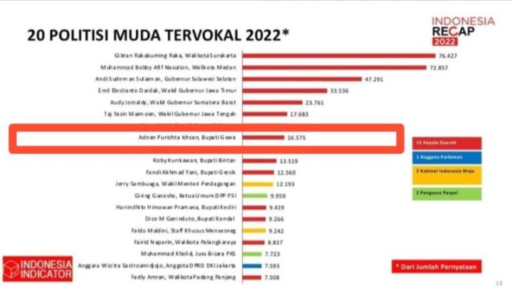 Direktur Komunikasi I2, Rustika Herlambang mengatakan, masuknya Bupati Gowa dalam 8 politisi muda tervokal ini karena pernyataan kerap dikutip di media massa online di sepanjang 2022. Pernyataan Bupati Adnan dikutip media online di Indonesia sebanyak 16.575 kali di 2022.