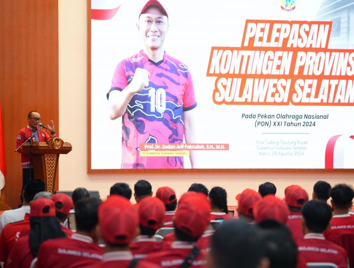 BERITA.NEWS,Makassar- Pj Gubernur Sulawesi Selatan, Prof Zudan Arif Fakrulloh, melepas secara resmi 630 kontingen Sulsel yang akan berlaga di Pekan Olahraga Nasional (PON) Aceh – Sumatera Utara (Aceh-Sumut), di Aula Tudang Sipulung, Rumah Jabatan Gubernur Sulsel, Kamis malam, 29 Agustus 2024.