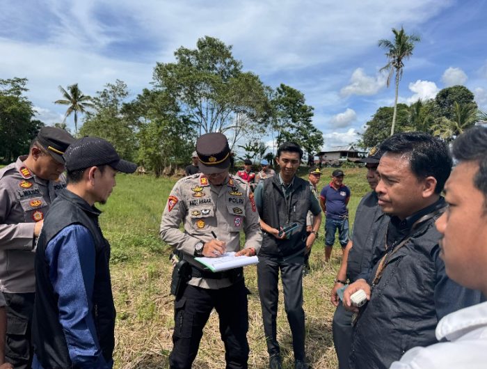 Puluhan aparat kepolisian bersenjata lengkap tampak berjaga di sekitar area sawah yang menjadi objek sengketa hukum.