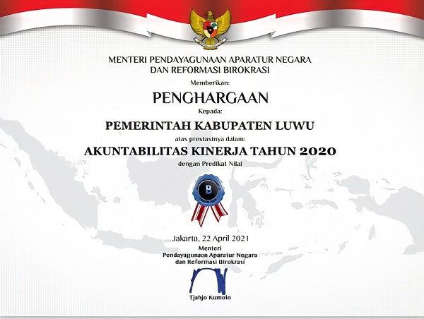 “Dalam acara tadi, Menteri PANRB memberikan hasil evaluasi secara simbolis kepada 66 pemerintah provinsi/kabupaten/kota yang hadir secara langsung di acara tersebut. Alhamdulillah, tahun ini Kabupaten Luwu juga mendapat penghargaan karena berhasil naik peringkat. Dari tahun lalu mendapat nilai CC, tahun ini naik menjadi nilai B. Semoga tahun depan bisa meningkat lagi menjadi nilai BB,” ungkap H Sulaiman.