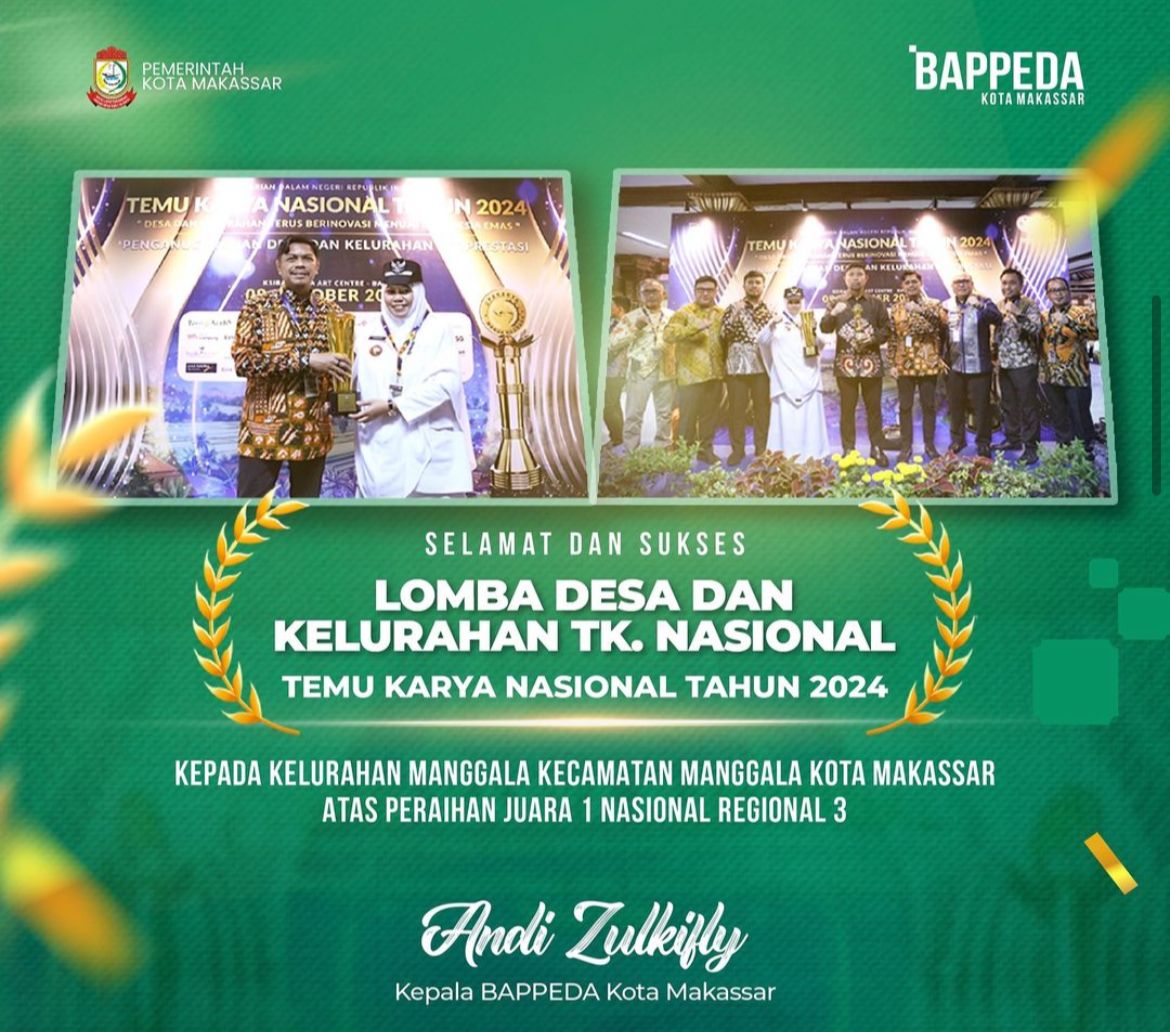 “Selamat kepada Kelurahan Manggala, Kecamatan Manggala Kota Makassar atas prestasi membanggakan yang diraih yaitu Juara I Nasional Regional 3 dalam Lomba Desa dan Kelurahan Tingkat Nasional pada Temu Karya Nasional 2024,” ujar Zulkifly.
