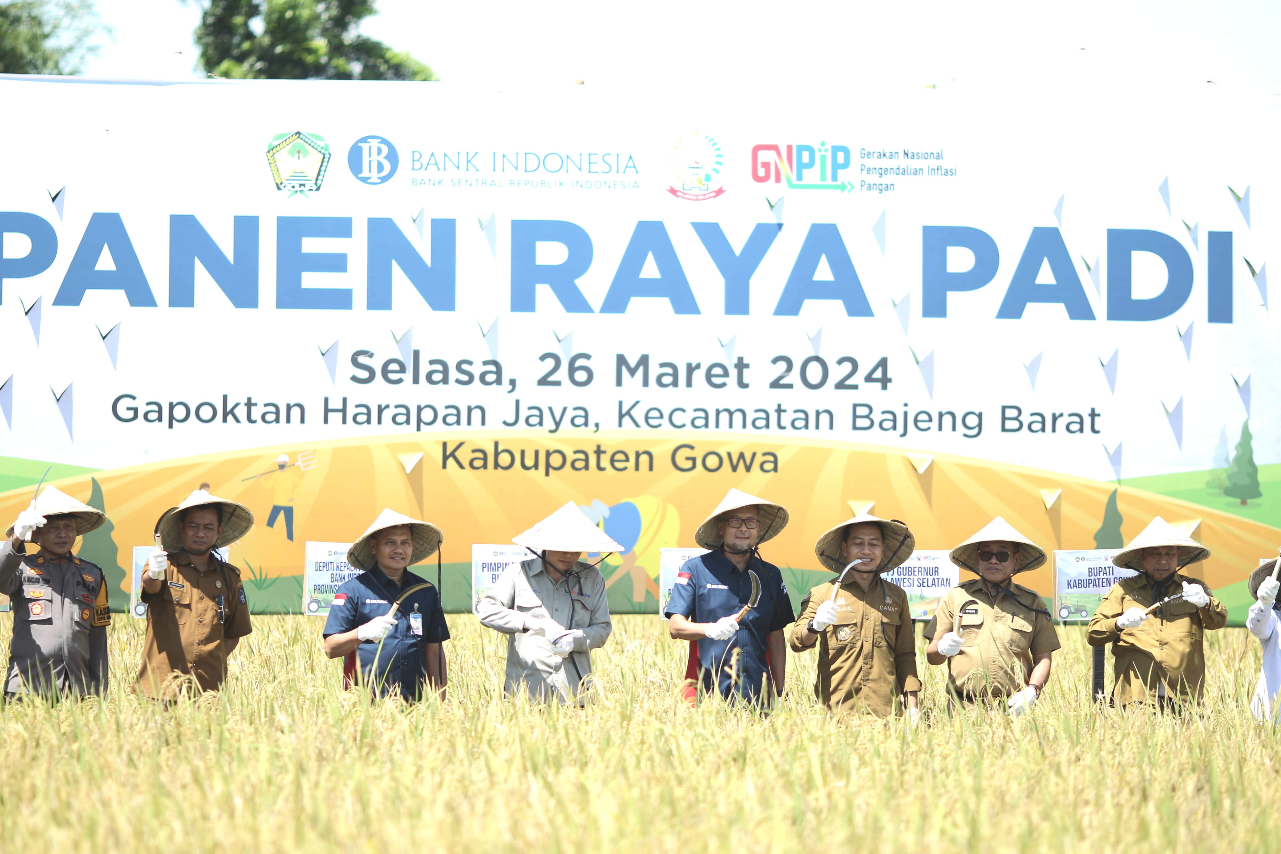 BERITA.NEWS,Gowa- Bank Indonesia (BI) Sulsel bersama Gabungan Kelompok Tani (Gapoktan) Harapan Jaya melakukan Panen Raya Padi di Kecamatan Bajeng Barat, Kabupaten Gowa. Senin (26/3/2024).