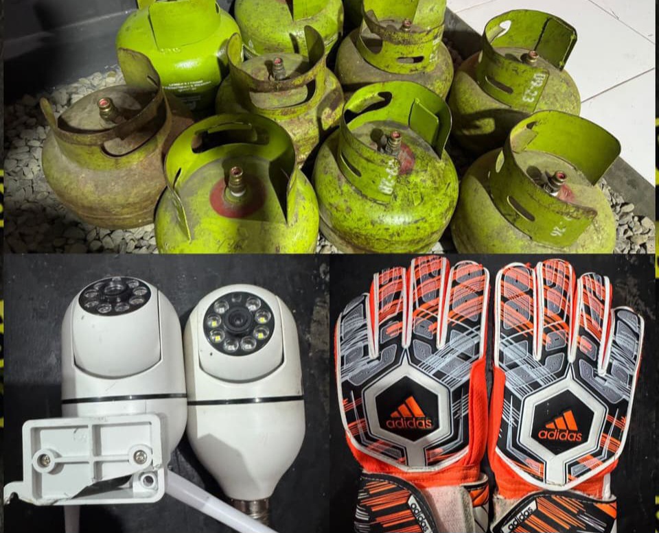 Korban pertama, berinisial NS (34), kehilangan tiga tabung gas, empat helm, satu pasang sarung tangan bola, empat kamera CCTV, dan sejumlah uang tunai.