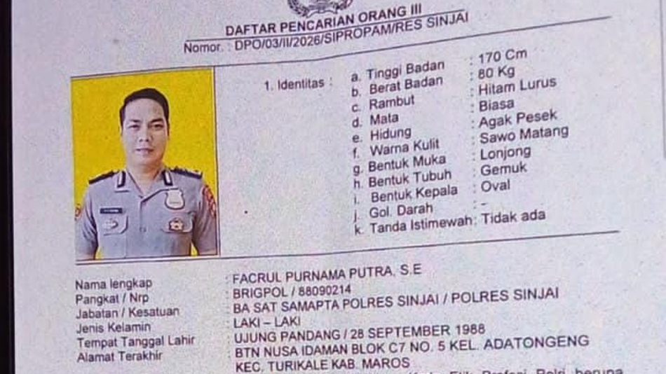 BERITA.NEWS, Sinjai — Penetapan status Daftar Pencarian Orang (DPO) oleh Sipropam Polres Sinjai terhadap oknum anggota Polri, Brigpol Fachrul Purnama Putra, memicu polemik.