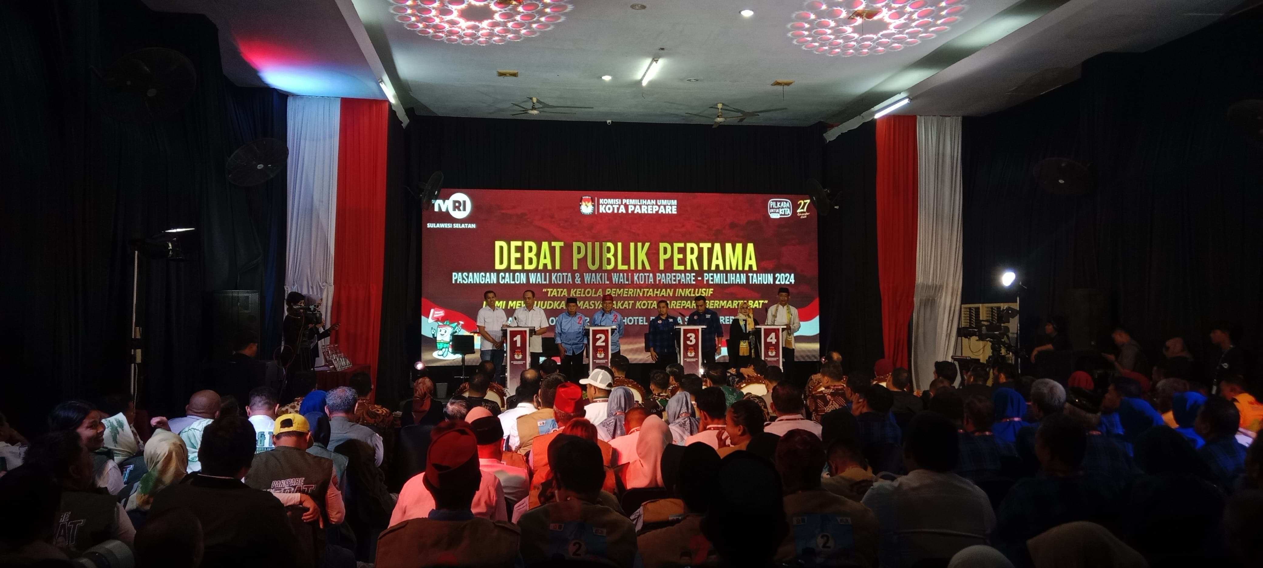 Debat publik pertama ini digelar pada Sabtu malam, 26 Oktober 2024, di ballroom Hotel Delima Sari, Jalan Andi Makkasau Kota Parepare.