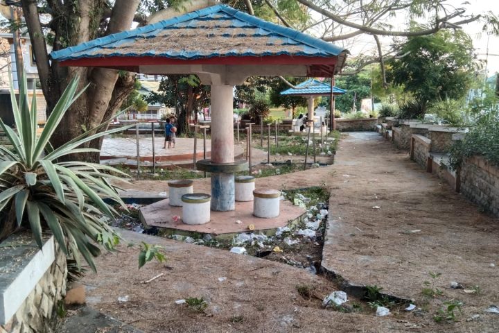 Pada Siang hari, terlihat sampah berbagai jenis yang berserakan dan rumput belukar yang tumbuh tak teratur serta gazebo yang ada didalamnya tak tertata rapi lagi.