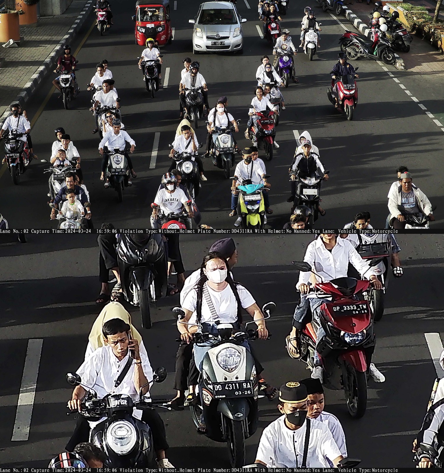 “Dari rekaman pelanggaran itu kemudian kami lihat sebagian besar peserta konvoi berkedok bagi takjil ini berboncengan 3, sepeda motornya tidak dilengkapi spion dan plat nomor bahkan menggunakan knalpot brong” Jelas Kombes Pol I Made Agus Prasatya.