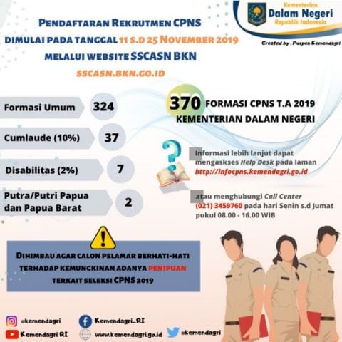 “Tahun ini Kemendagri membuka seleksi 370 formasi CPNS, jenis formasinya, yaitu cum laude sebesar 10 persen, disabilitas 2 persen, putera/puteri Papua dan Papua Barat 2 orang, serta formasi umum 324 orang jumlah totalnya 370 formasi,” kata Kepala Pusat Penerangan (Kapuspen) Kemendagri, Bahtiar di Jakarta, Senin (11/11), seperti dikutip dari JPNN.