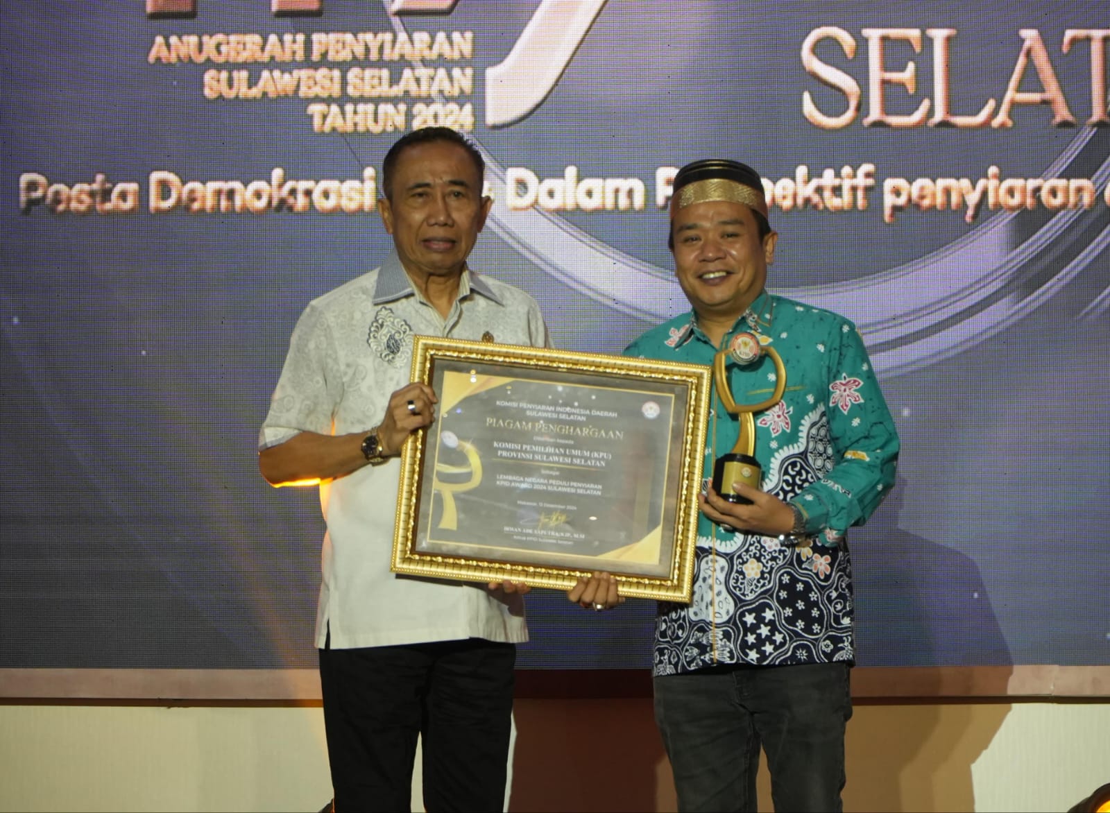 BERITA.NEWS,Makassar- Komisi Pemilihan Umum (KPU) Sulawesi Selatan (Sulsel) mendapat penghargaan di ajang KPID Award 2024 kategori lembaga negara paling peduli lembaga penyiaran.