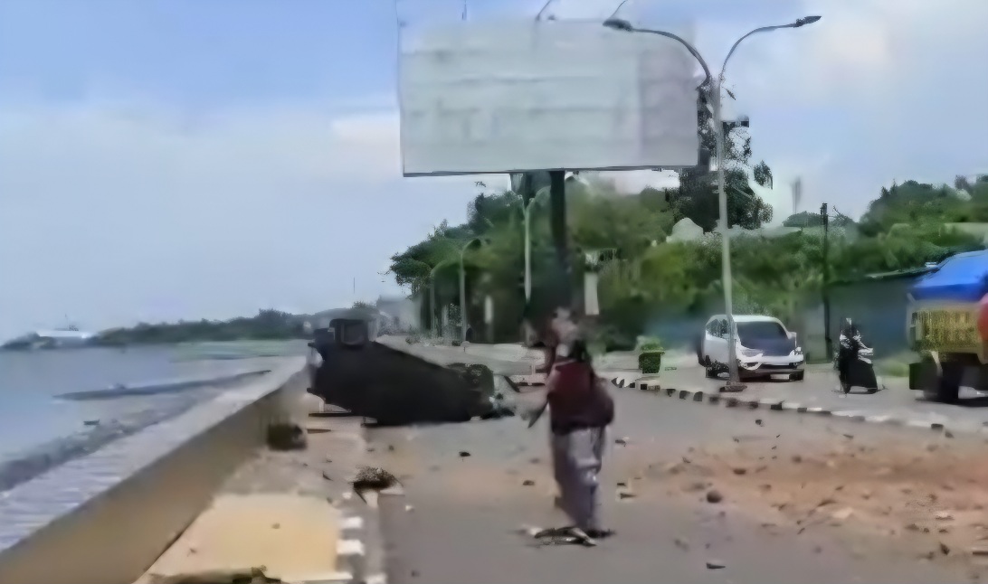 Ia langsung membanting setir ke kanan untuk menghindari tabrakan. Nahas, mobil justru menabrak pot bunga yang berada di median jalan dan terpental hingga terguling keras di badan jalan.