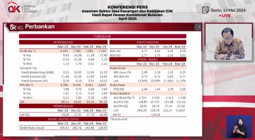 Rapat Bulanan Dewan Komisioner OJK menerangkan ditengah volatilitas pasar keuangan global, kinerja industri perbankan Indonesia per Maret 2024 tetap resilien dan stabil didukung oleh tingkat profitabilitas ROA sebesar 2,62 persen (Februari 2024: 2,52 persen) dan NIM sebesar 4,59 persen (Februari 2024: 4,49 persen).