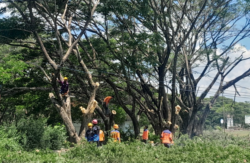 Dalam kegiatan tersebut, tim melakukan pemangkasan pohon dan penataan kabel listrik yang tampak semrawut di sekitar area Kantor Bupati.