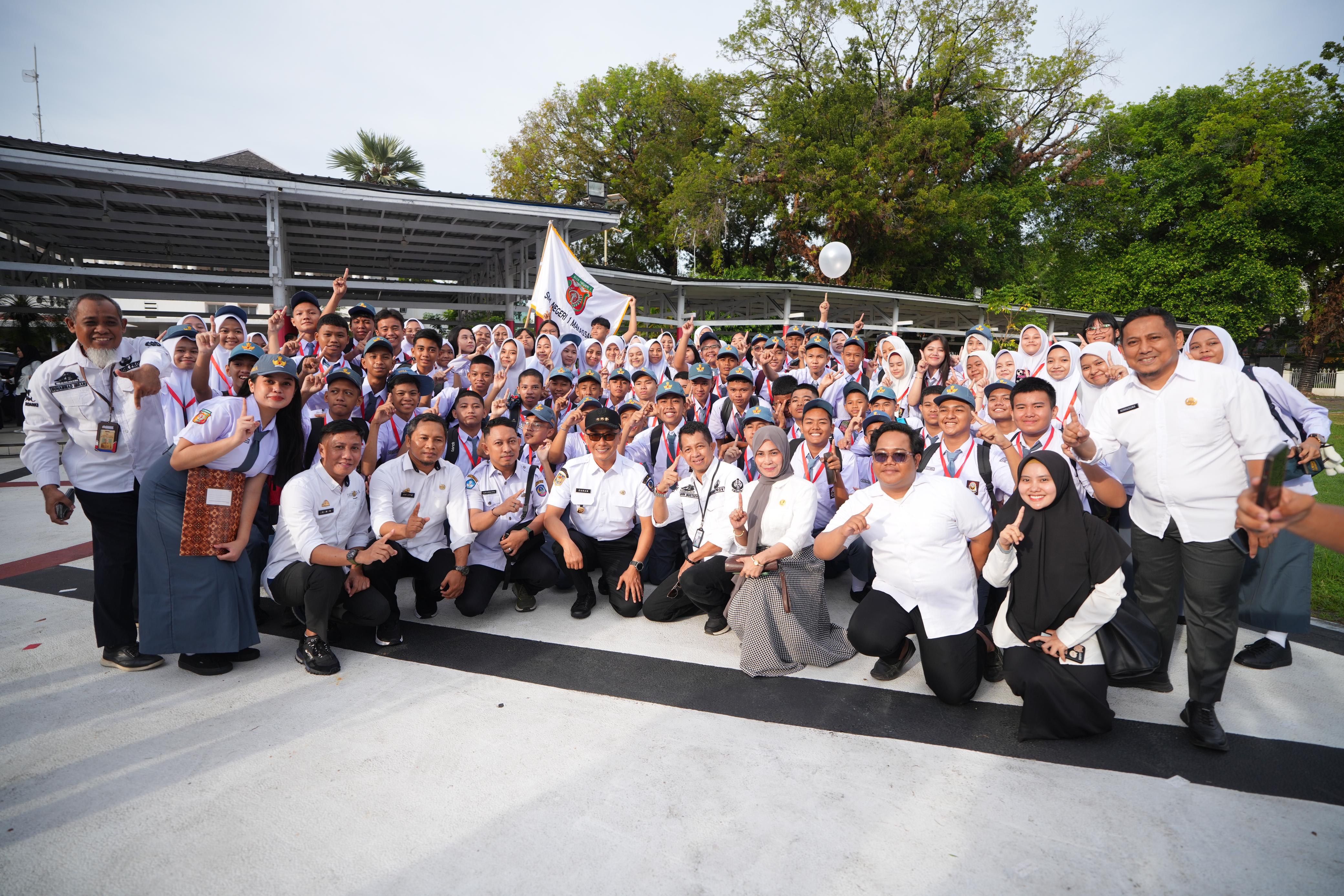 Pj Gubernur Sulsel Prof Zudan Arif Fakhrulloh berfoto dengan siswa usai memipin upacara MPLS di Rujab Gubernur (dok)