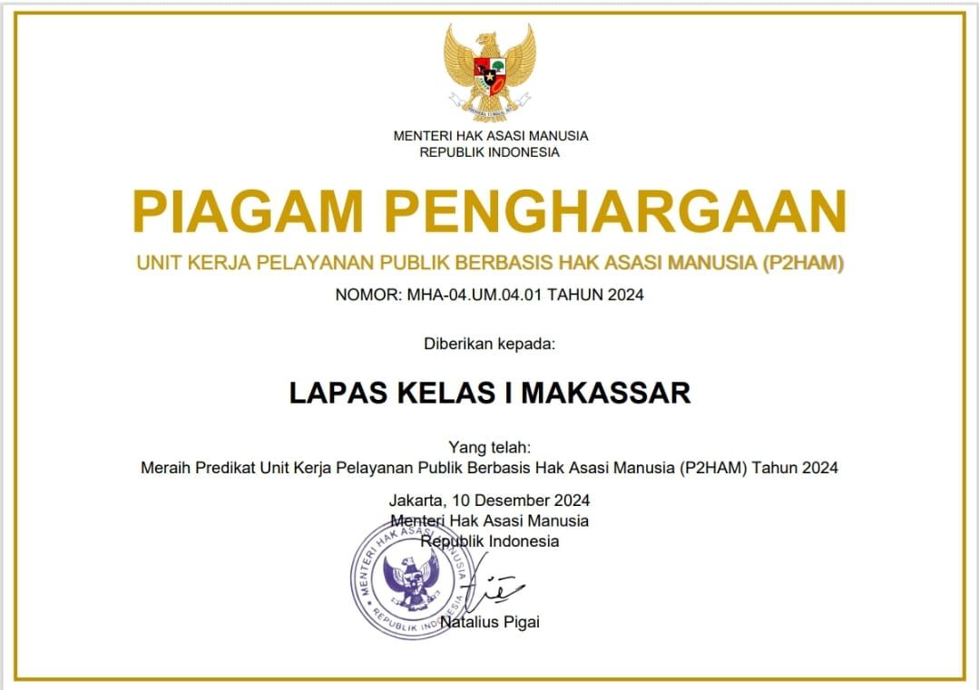 Pasalnya, momen peringatan tersebut Lapas Makassar menerima penghargaan Pelayanan Publik Berbasis Hak Asasi Manusia (P2HAM).