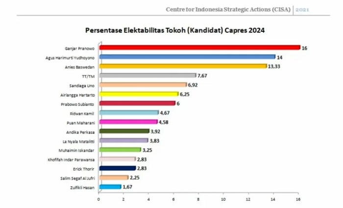 “Jika Pemilihan Presiden dilakukan saat ini, Gubernur Jawa Tengah Ganjar Pranowo keluar sebagai pemenang dengan mendapatkan 16 persen,” kata Direktur Eksekutif CISA Herry Mendrofa dalam keterangan tertulisnya, di Jakarta, Jumat (10/12/2021).