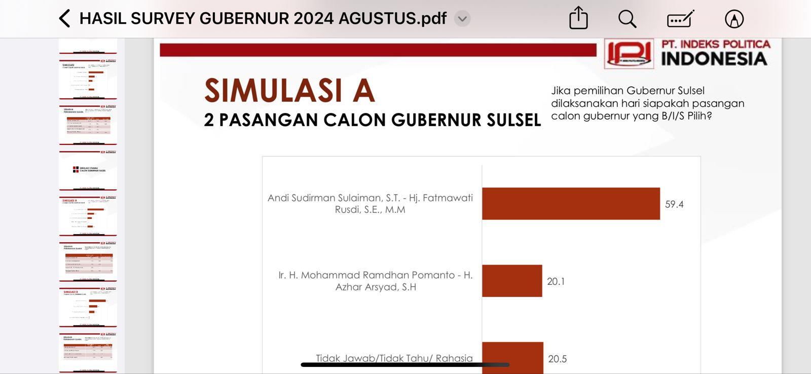 Pada simulasi dua pasang calon, Andi Sudirman-Fatmawati Rusdi melejit dengan 59,4 persen. Ramdhan Pomanto-Azhar Arsyad 20,1 persen dan responden yang tidak menjawab ada 20,5 persen.