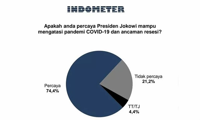 Namun, masyarakat meyakini Presiden Jokowi juga mampu mengatasi resesi. Sebanyak 74,4 persen responden percaya Jokowi mampu mengatasi pandemik dan resesi, hanya 21,2 persen yang tidak percaya dan tidak tahu/tidak jawab sebanyak 4,4 persen.