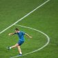 Luka Jovic menendang bola ke tribun Santiago Bernabeu saat diperkenalkan secara resmi sebagai pemain Real Madrid, Rabu (12/6/2019). (Foto: IST)